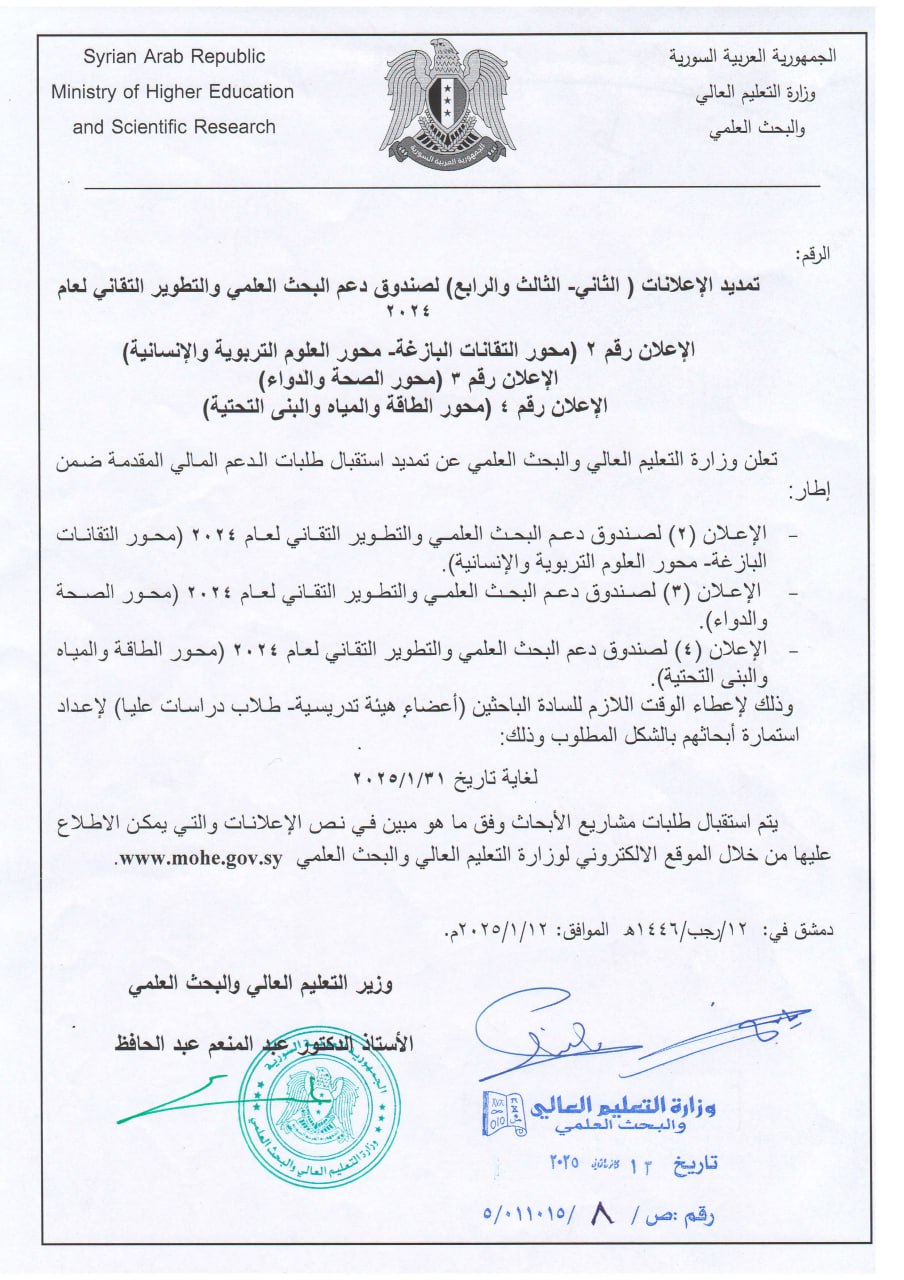 وزارة التعليم العالي: إعلان تمديد الإعلانات لصندوق دعم البحث العلمي والتطوير التقاني لعام 2024.