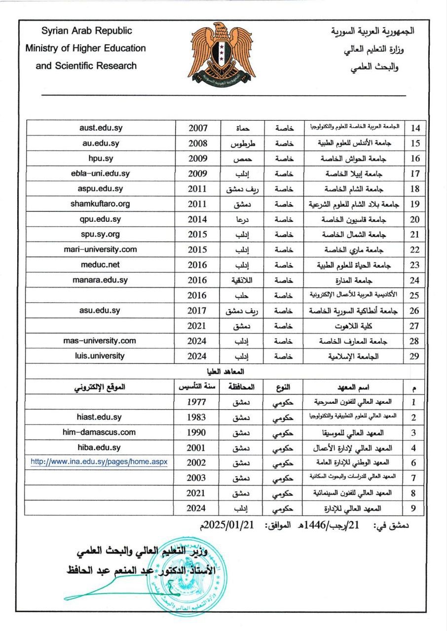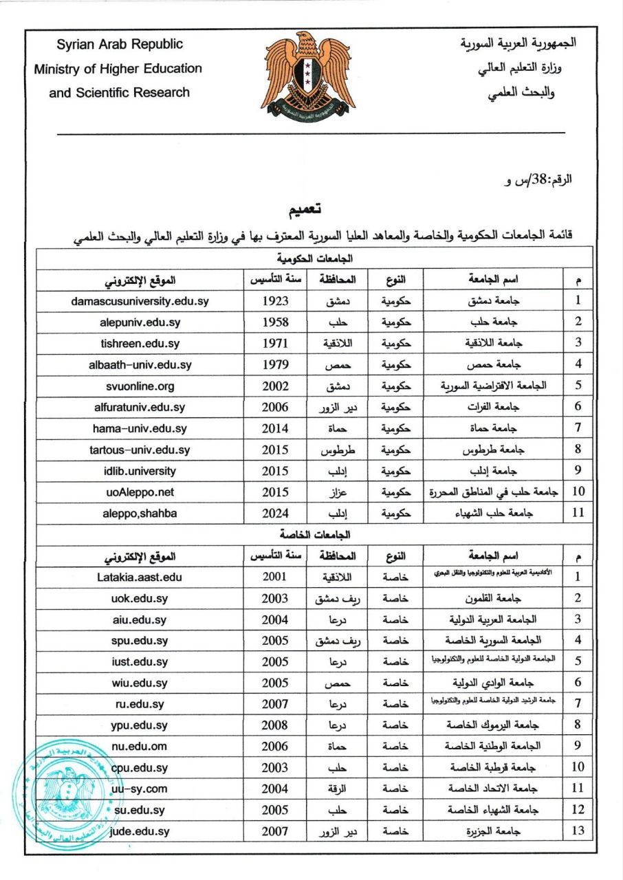 أصدرت وزارة التعليم العالي والبحث العلمي في الجمهورية العربية السورية القرار رقم 38/ س و، المتضمن قائمة الجامعات الحكومية والخاصة والمعاهد العليا المعترف بها رسميًا.