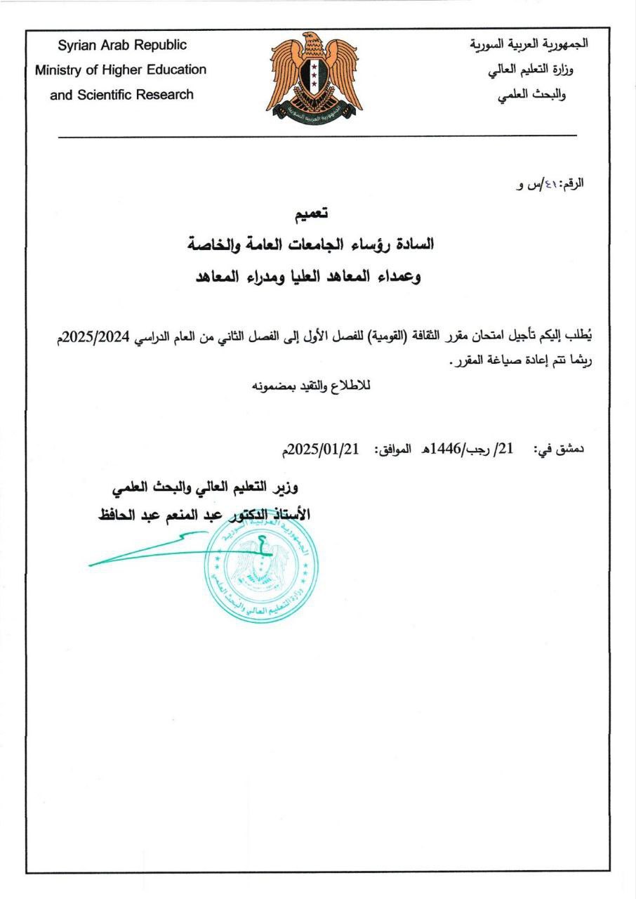 يُطلب إليكم تأجيل امتحان مقرر الثقافة (القومية) للفصل الأول إلى الفصل الثاني من العام الدراسي 2025/2024م ريثما تتم إعادة صياغة المقرر.