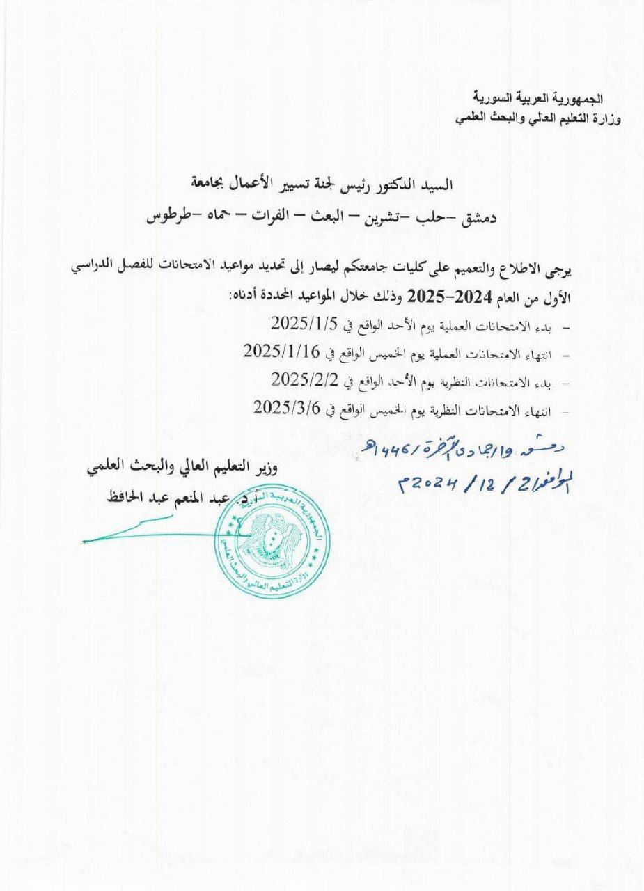 يرجى الاطلاع والتعميم على كليات جامعتكم ليصار إلى تحديد مواعيد الامتحانات للفصل الدراسي