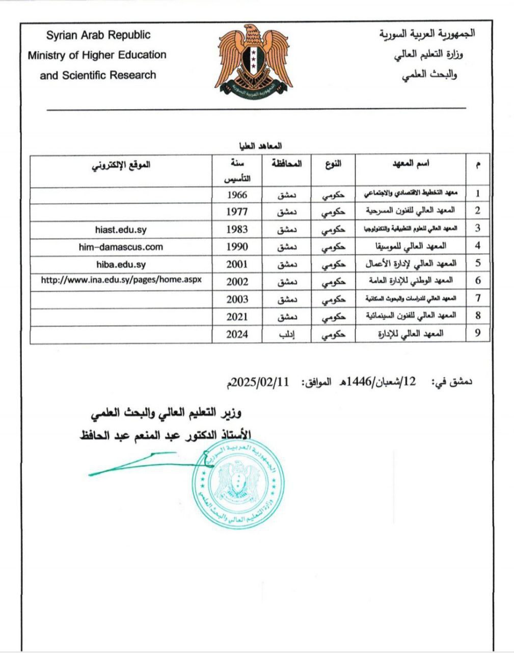 أصدرت وزارة التعليم العالي والبحث العلمي في الجمهورية العربية السورية القرار رقم 110/س و، المتضمن قائمة الجامعات الحكومية والخاصة والمعاهد العليا المعترف بها رسميًا.