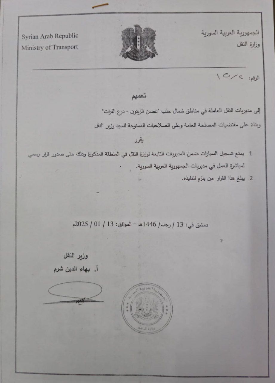إلى مديريات النقل العاملة في مناطق شمال حلب "غصن الزيتون - درع الفرات"