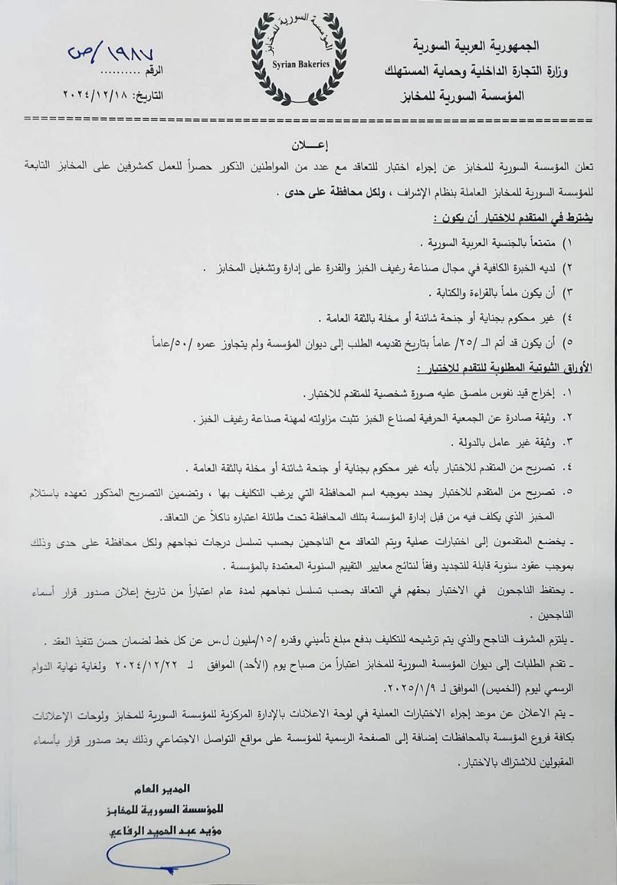 تعلن المؤسسة السورية للمخابز عن إجراء اختبار للتعاقد مع عدد من المواطنين الذكور حصراً للعمل كمشرفين على المخابز التابعة للمؤسسة السورية للمخابز العاملة بنظام الإشراف ، ولكل محافظة على حدى