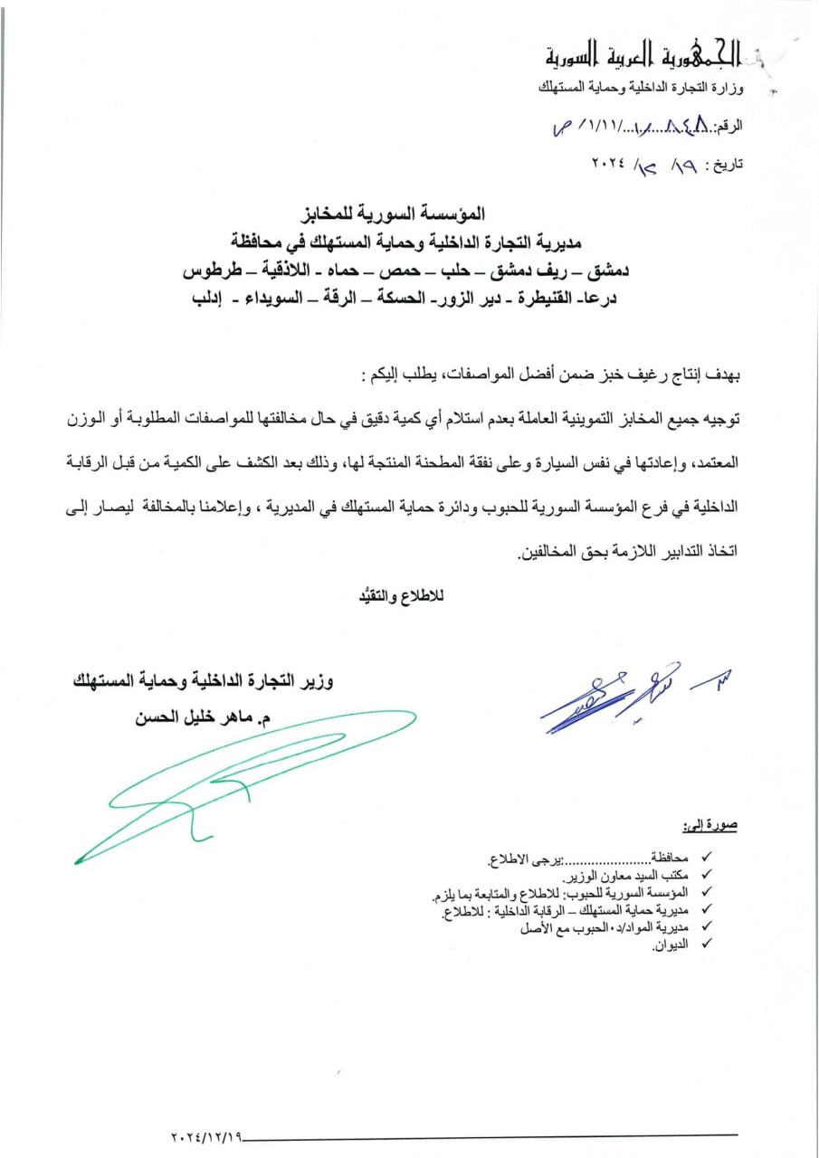 توجيه جميع المخابز التموينية العاملة بعدم استلام أي كمية دقيق في حال مخالفتها للمواصفات المطلوبة أو الوزن المعتمد، وإعادتها في نفس السيارة وعلى نفقة المطحنة المنتجة لها، وذلك بعد الكشف على الكمية من قبل الرقابة الداخلية في فرع المؤسسة السورية للحبوب ودائرة حماية المستهلك في المديرية ، وإعلامنا بالمخالفة ليصار إلى اتخاذ التدابير اللازمة بحق المخالفين.