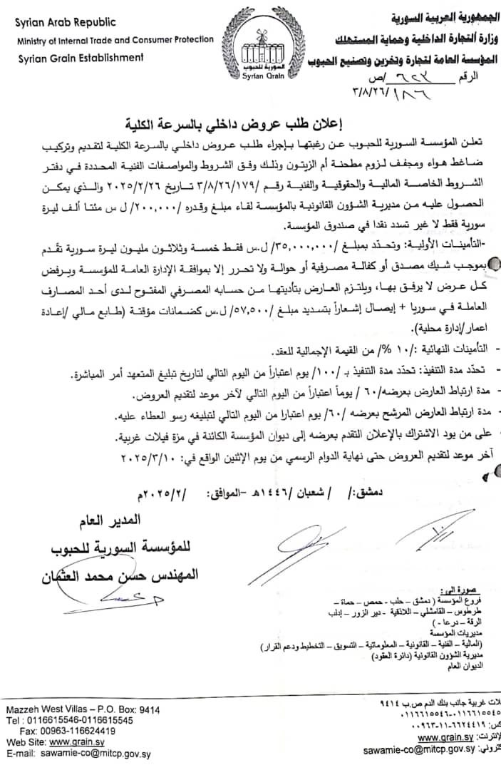 تعلن المؤسسة السورية للحبوب عن رغبتها بإجراء طلب عروض داخلي بالسرعة الكلية لتقديم وتركيب ضاغط هواء ومجفف لزوم مطحنة أم الزيتون وذلك وفق الشروط والمواصفات الفنية المحددة في دفتر الشروط الخاصة المالية والحقوقية والفنية رقم / ٣/٨/٢٦/١٧٩ تاريخ ٢٠٢٥/٢/٢٦ والذي يمكن الحصول عليه من مديرية الشؤون القانونية بالمؤسسة لقاء مبلغ وقدره / ٢۰۰,۰۰۰ / ل س منتا ألف ليرة سورية فقط لا غير تسدد نقدا في صندوق المؤسسة.