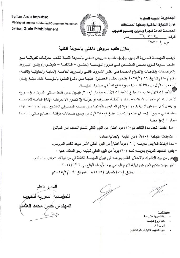 المؤسسة السورية للحبوب تعلن عن طلب عروض داخلي لتوريد محركات كهربائية وضاغط هواء