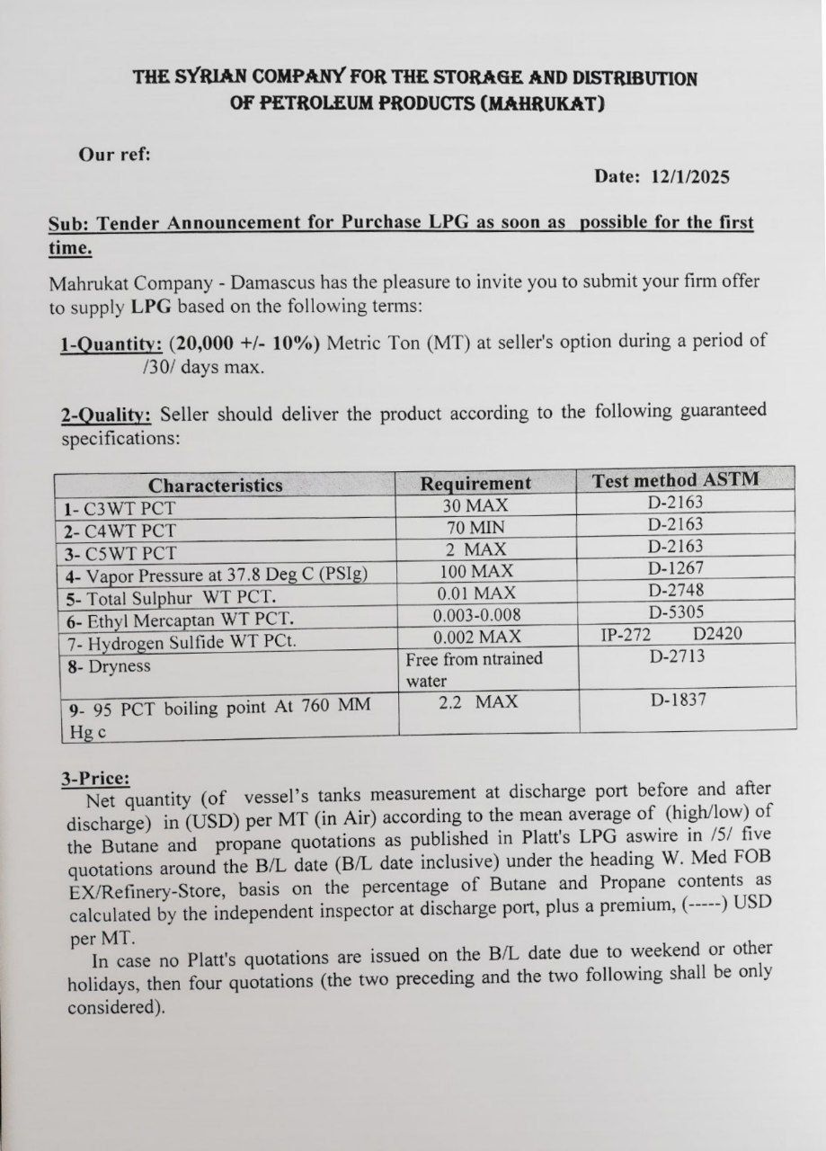 الموضوع: إعلان مناقصة لشراء غاز سائل بأسرع ما يمكن للمرة الأولى.