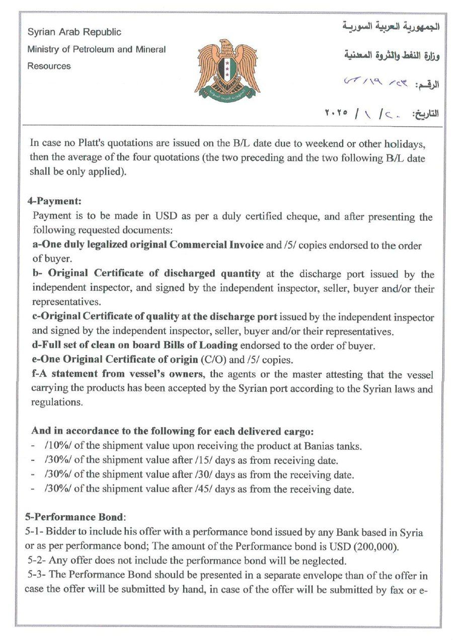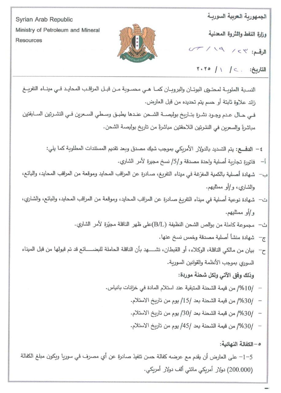 - تخضع كافة البنود والشروط الأخرى غير المذكورة في هذا الإعلان لدفتر الشروط العامة لشراء النفط الخام والمشتقات النفطية اصدار 2025 وذلك بما لا يتعارض مع بنود هذا الإعلان.