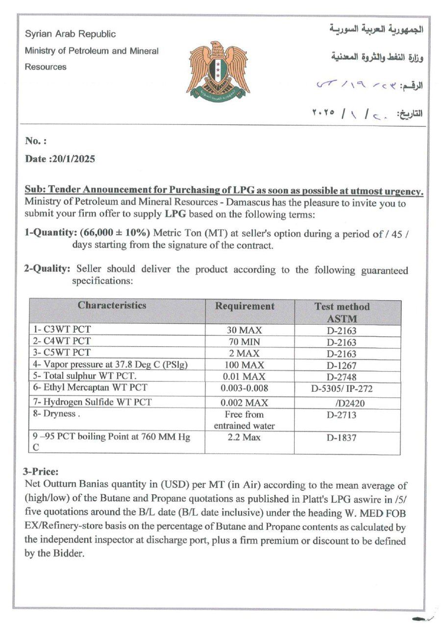 يسر وزارة النفط والثروة المعدنية - دمشق دعوتكم لتقديم عرضكم الثابت لتوريد مادة الغاز المنزلي