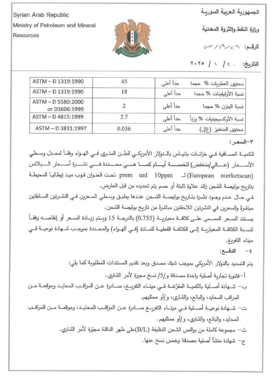 يسر وزارة النفط والثروة المعدنية - دمشق دعوتكم لتقديم عرضكم الثابت لتوريد مادة بنزين أوكتان /90/ استناداً إلى البنود التالية: