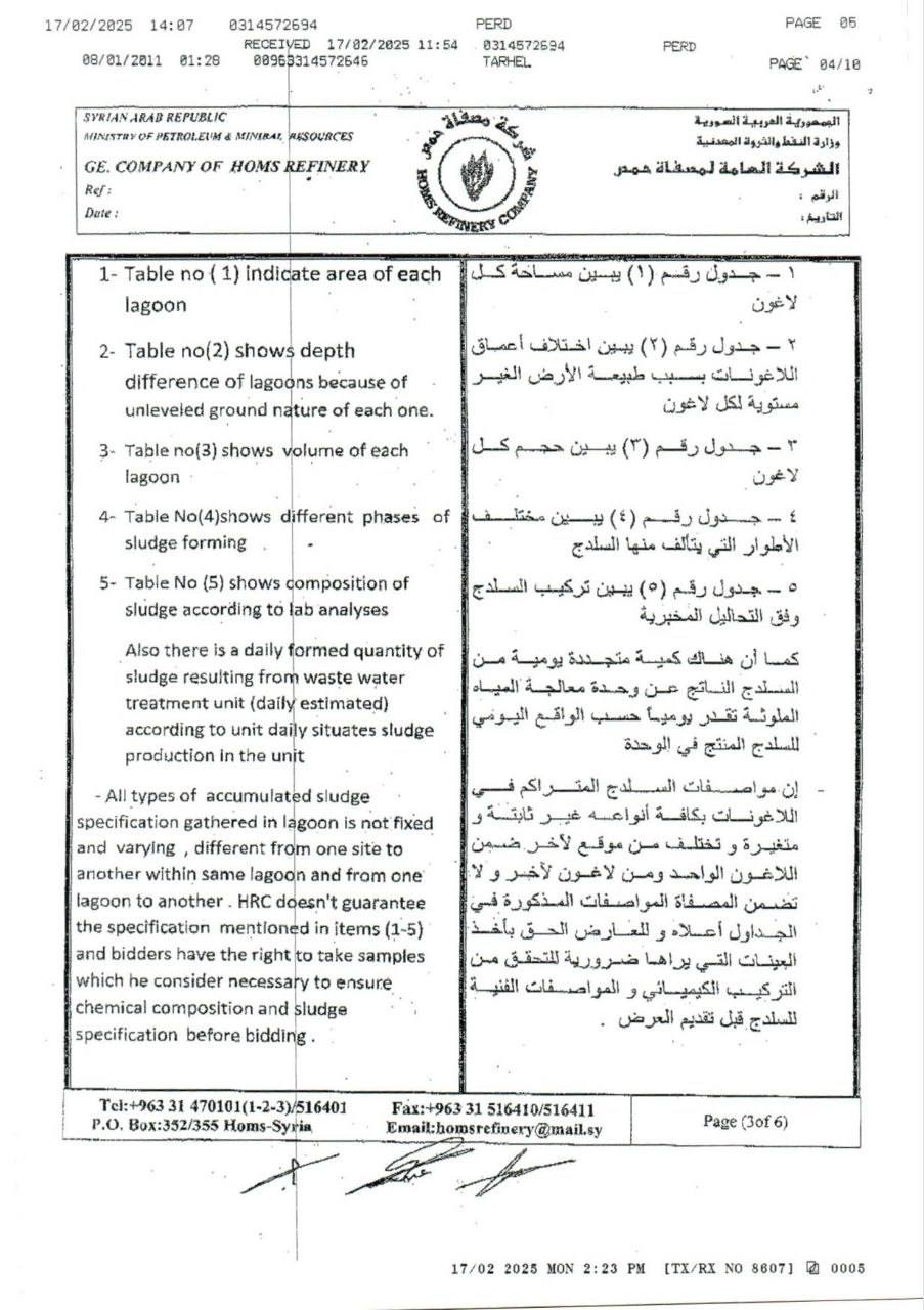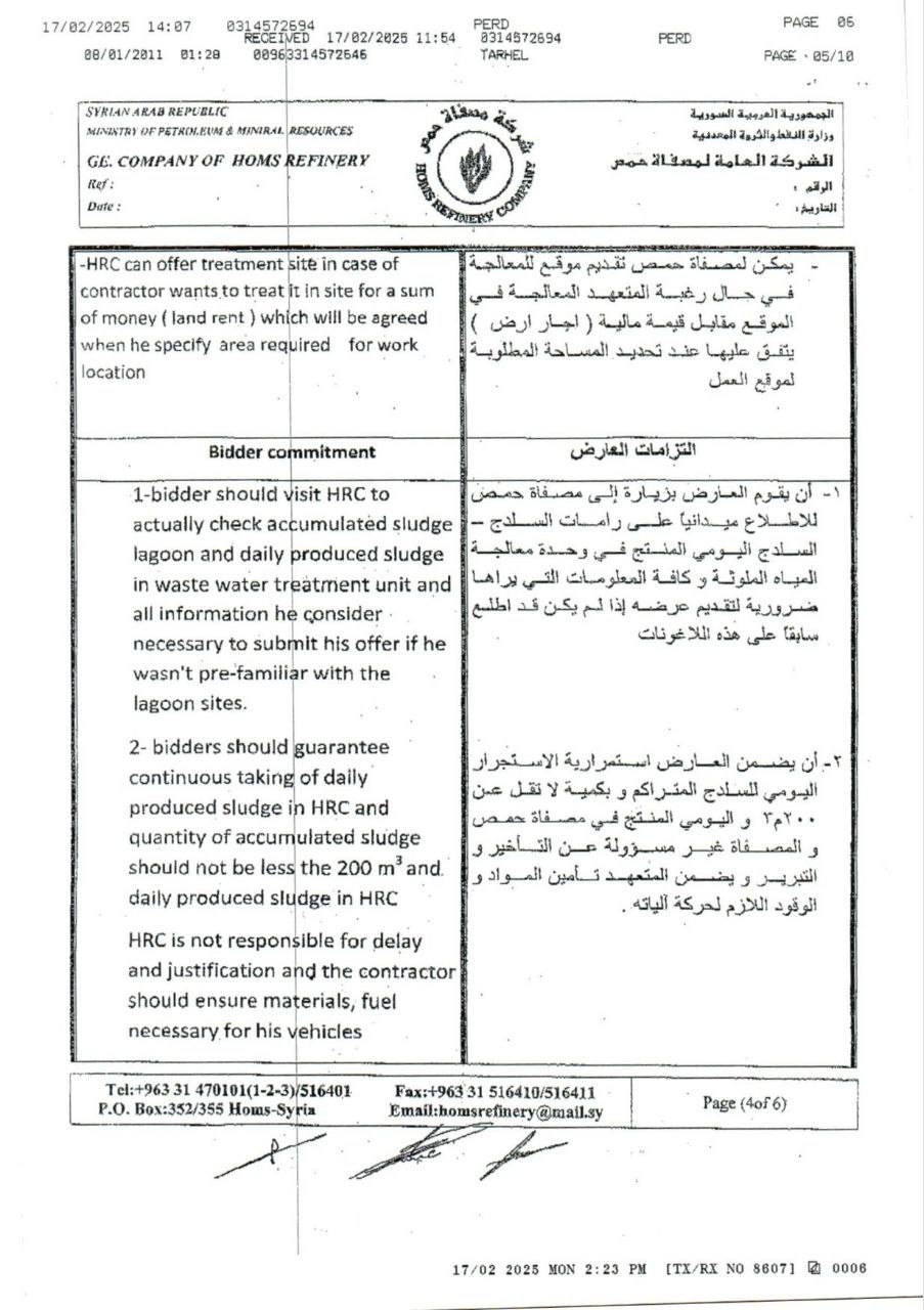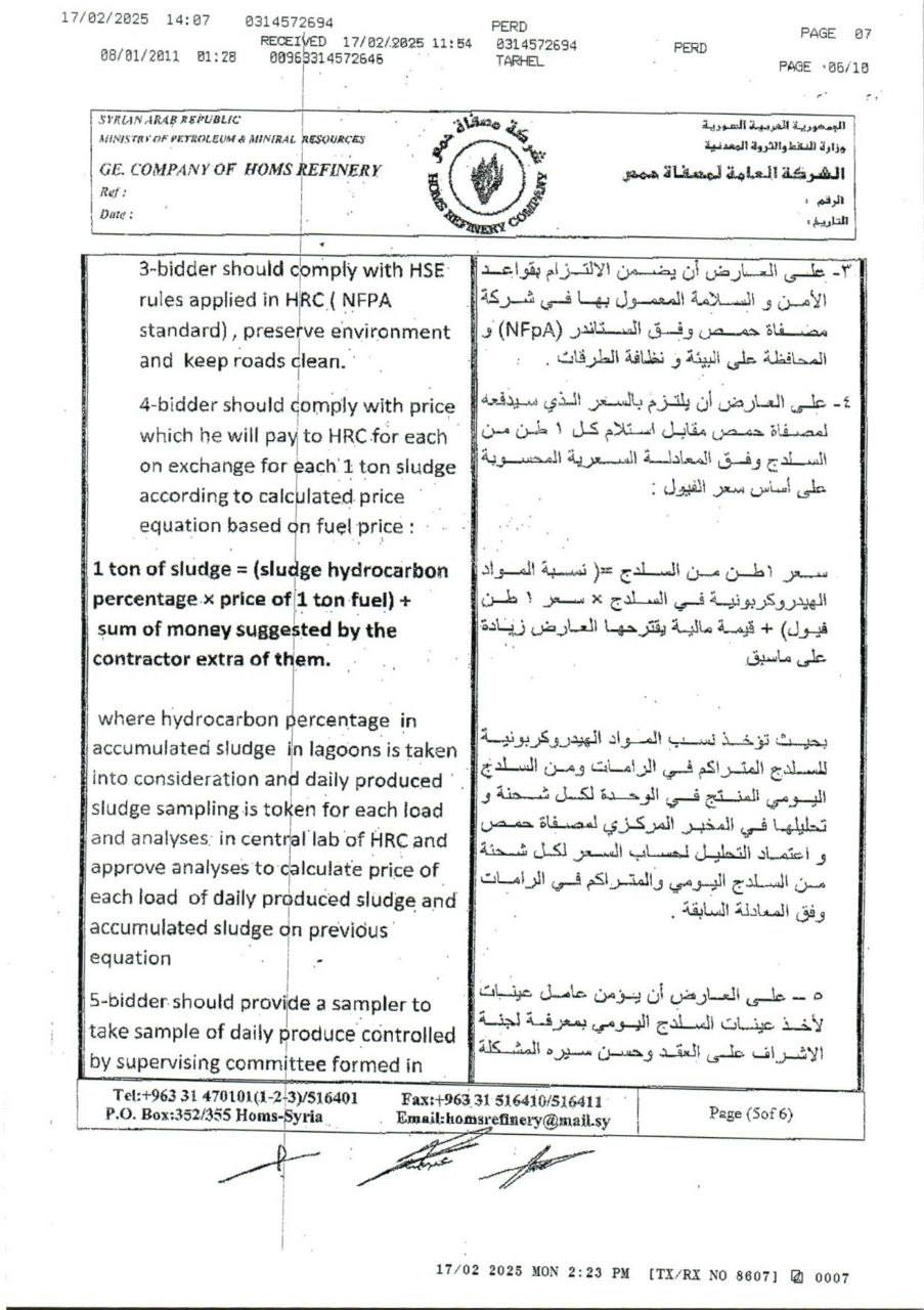 بالفاكس أو الإيميل ترفق نسخة عنها على أن يتم تسليمها إلى وزارة النفط قبل إتمام التعاقد.