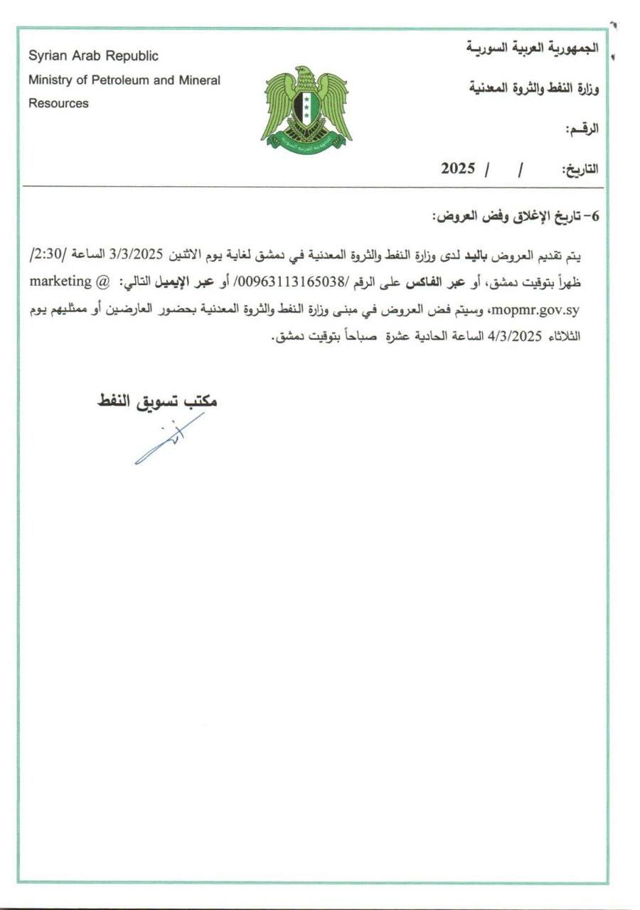 يتم تقديم العروض باليد لدى وزارة النفط والثروة المعدنية في دمشق لغاية يوم الاثنين 3/3/2025 الساعة 2:30/ظهراً بتوقيت دمشق، أو عبر الفاكس على الرقم / 00963113165038 أو عبر الإيميل التالي: @marketing mopmr.gov.sy، وسيتم فض العروض في مبنى وزارة النفط والثروة المعدنية بحضور العارضين أو ممثليهم يوم الثلاثاء 4/3/2025 الساعة الحادية عشرة صباحاً بتوقيت دمشق.