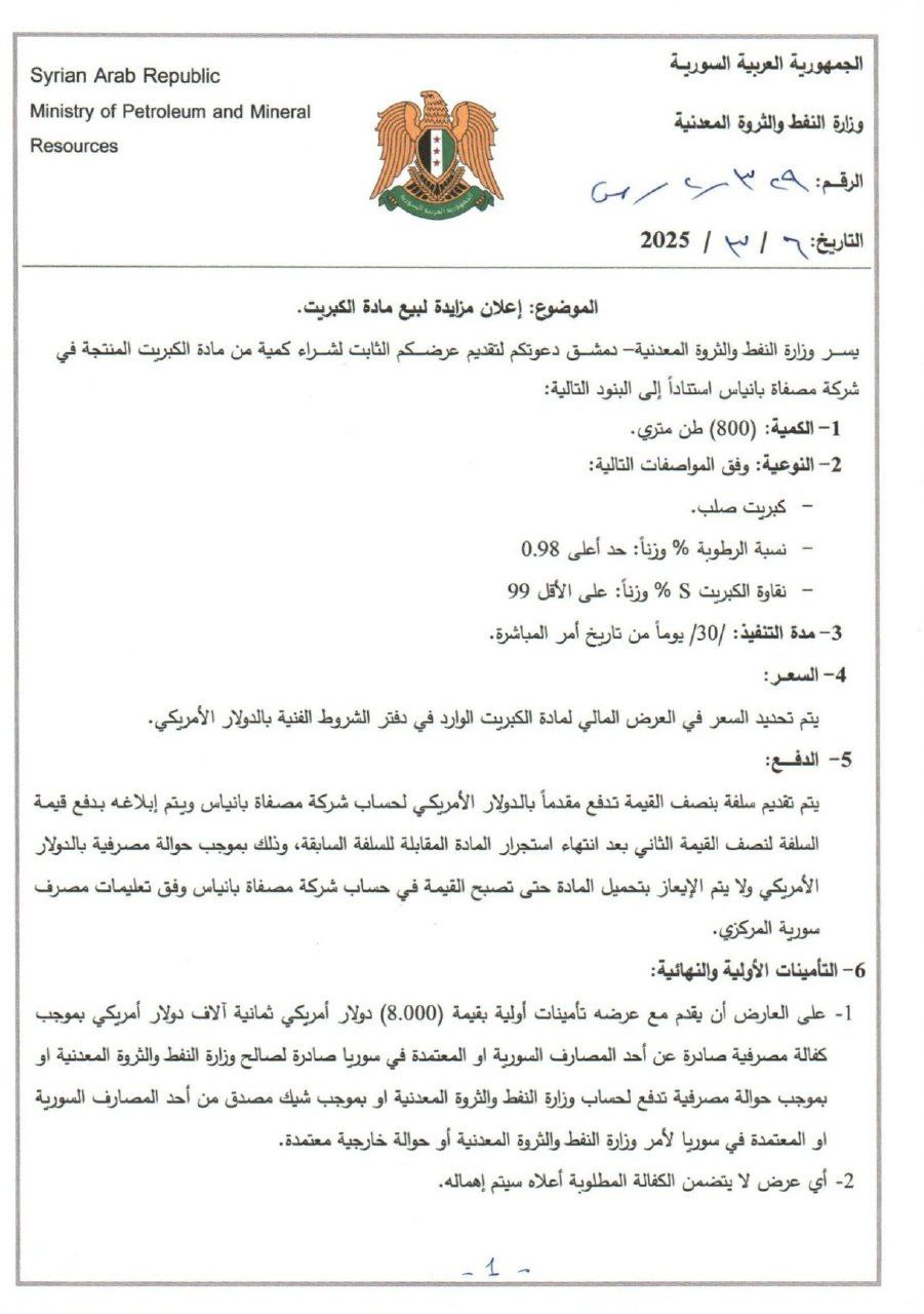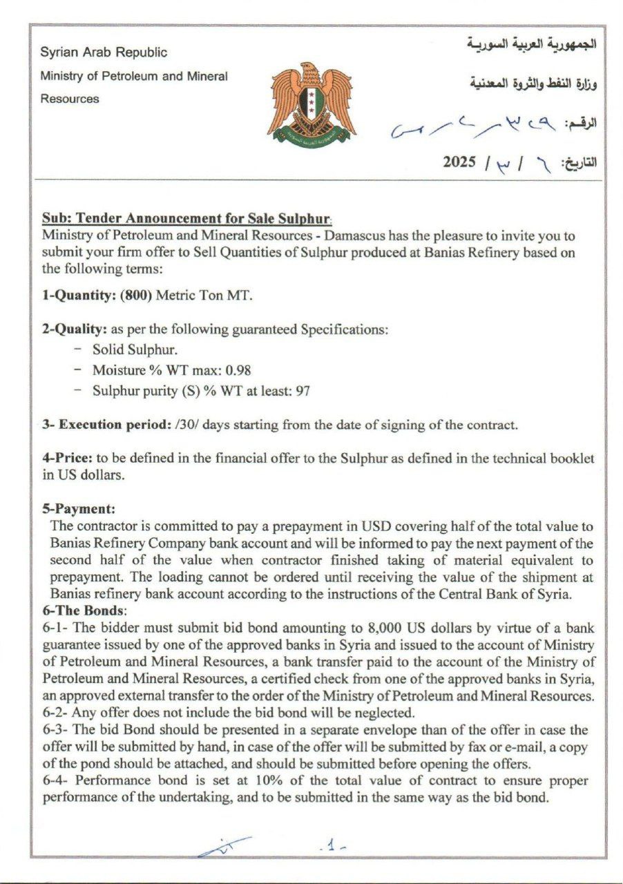 يسر وزارة النفط والثروة المعدنية - دمشق دعوتكم لتقديم عرضكم الثابت لشراء كمية من مادة الكبريت المنتجة في