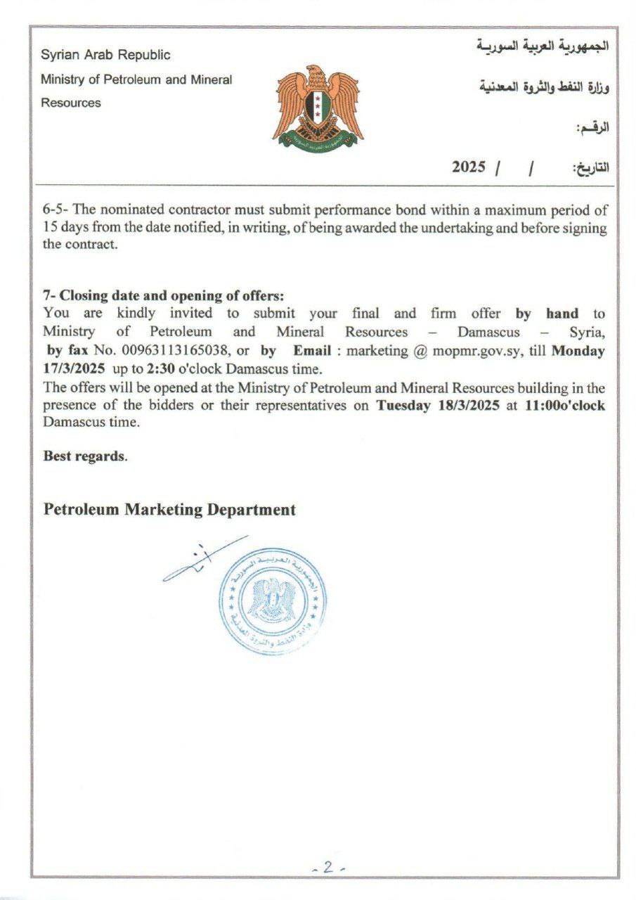 يتم تقديم العروض باليد لدى وزارة النفط والثروة المعدنية في دمشق لغاية يوم الاثنين 17/3/2025 الساعة 1:30/ظهراً بتوقيت دمشق، أو عبر الفاكس على الرقم /00963113141660 أو عبر الإيميل التالي : @ marketing mopmr.gov.sy، وسيتم فض العروض في مبنى وزارة النفط والثروة المعدنية بحضور العارضين أو ممثليهم يوم الثلاثاء 18/3/2025 الساعة الحادية عشرة صباحاً بتوقيت دمشق.