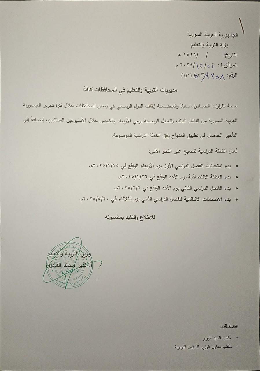 نتيجة للقرارات الصادرة سابقاً والمتضمنة إيقاف الدوام الرسمي في بعض المحافظات خلال فترة تحرير الجمهورية العربية السورية من النظام البائد، والعطل الرسمية يومي الأربعاء والخميس خلال الأسبوعين المتتاليين، إضافة إلى التأخير الحاصل في تطبيق المنهاج وفق الخطة الدراسية الموضوعة.