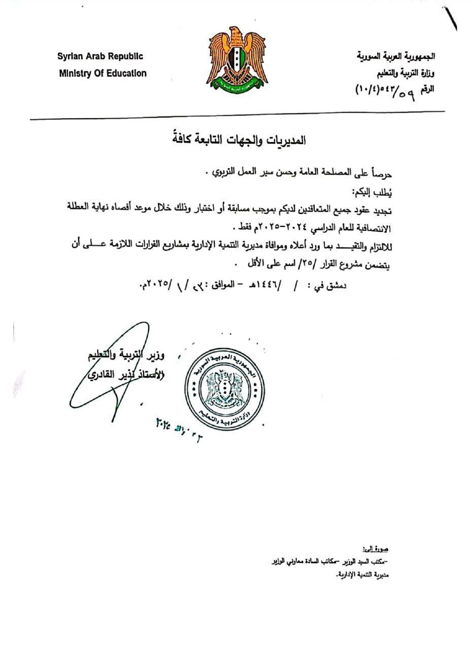 تجديد عقود جميع المتعاقدين لديكم بموجب مسابقة أو اختبار وذلك خلال موعد أقصاه نهاية العطلة الانتصافية للعام الدراسي ٢٠٢٤ - ٢٠٢٥م فقط .