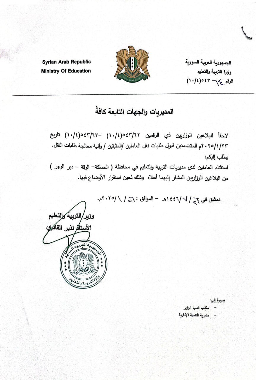 استثناء العاملين لدى مديريات التربية والتعليم في محافظة ( الحسكة - الرقة - دير الزور ) من البلاغين الوزاريين المشار إليهما أعلاه وذلك لحين استقرار الأوضاع فيها.