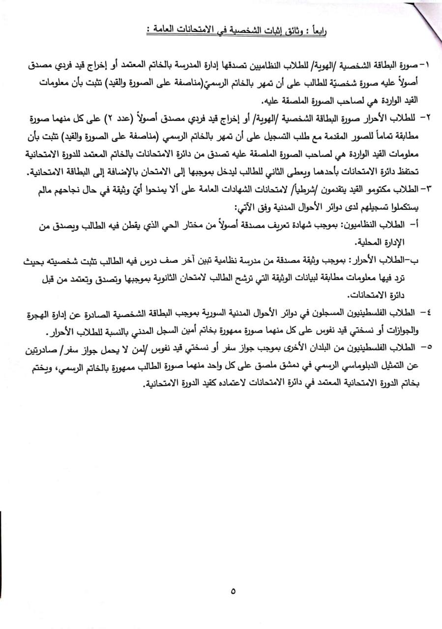 - يتقدم الطلاب السوريون ومن في حكمهم بطلبات تسجيلهم إلى دوائر الامتحانات في المحافظات التي يختارونها مرفقة بالشهادة الأصلية مصدقة حسب الأصول مع صورة عنها مصدقة من وزارة الخارجية في الجمهورية العربية السورية