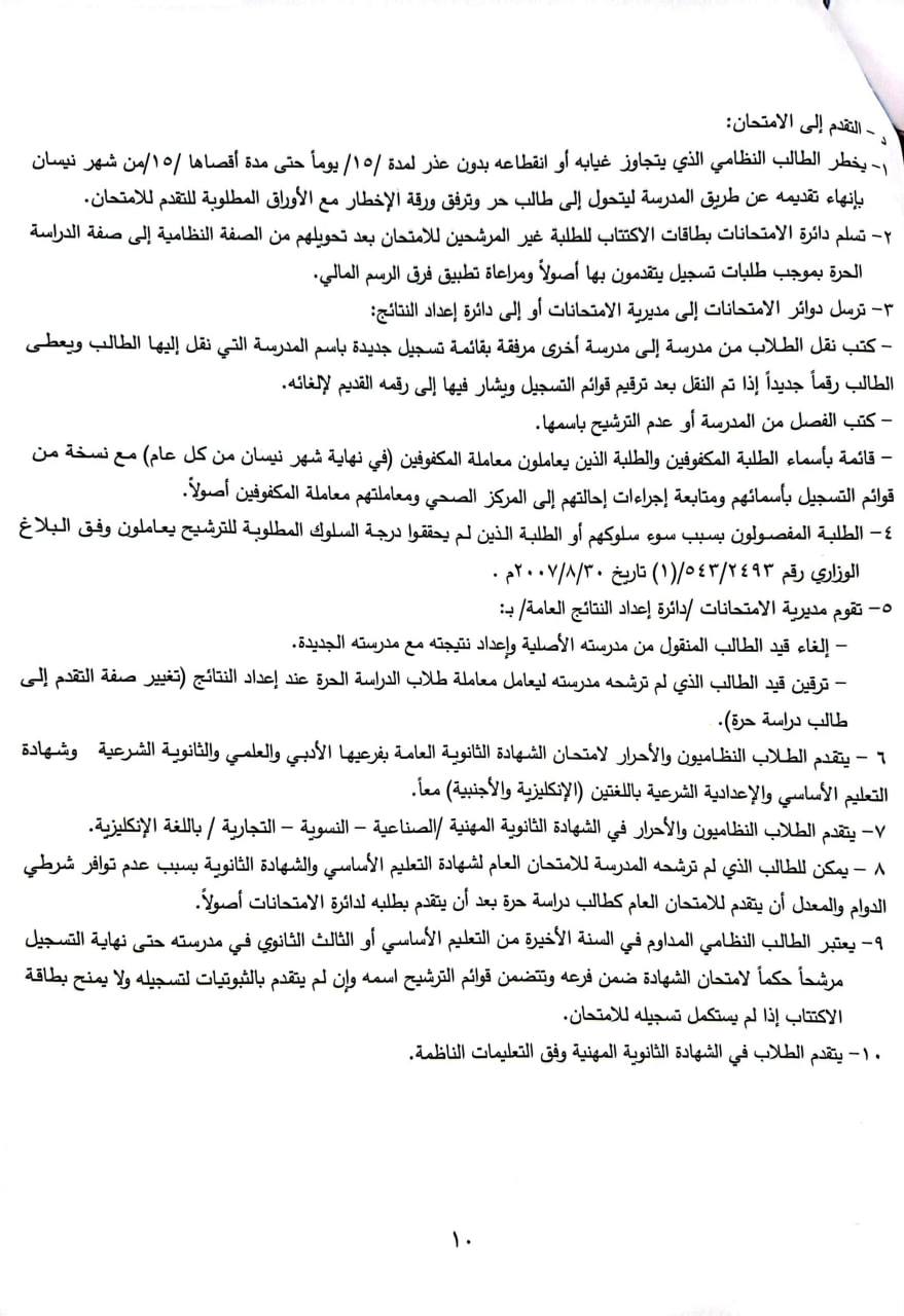 ۱۰- على دوائر الامتحانات والمدارس قبول :