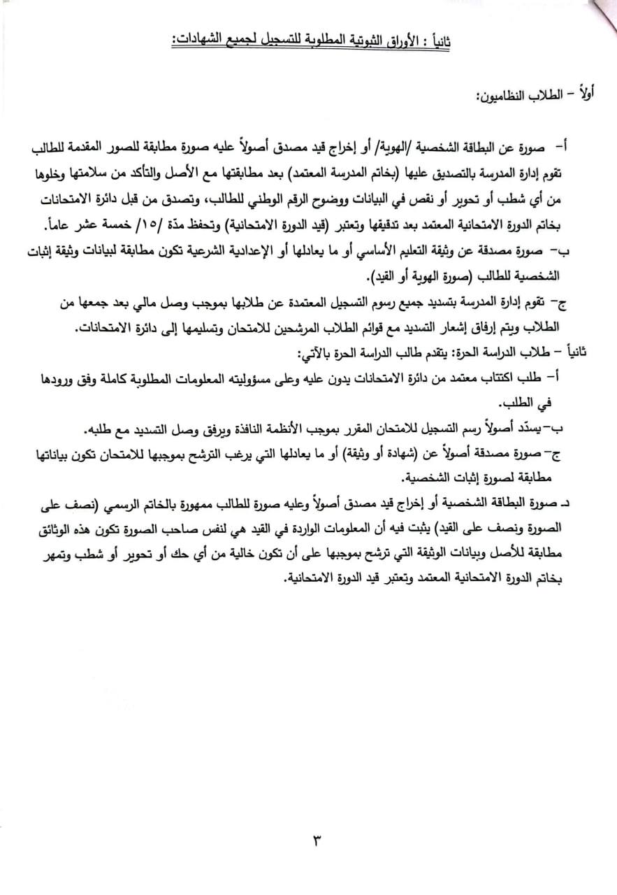 للطلاب الأحرار صورة البطاقة الشخصية الهوية أو إخراج قيد فردي مصدق أصولاً (عدد (۲) على كل منهما صورة مطابقة تماماً للصور المقدمة مع طلب التسجيل على أن تمهر بالخاتم الرسمي مناصفة على الصورة والقيد) تثبت بأن معلومات القيد الواردة هي لصاحب الصورة الملصقة عليه تصدق من دائرة الامتحانات بالخاتم المعتمد للدورة الامتحانية تحتفظ دائرة الامتحانات بأحدهما ويعطى الثاني للطالب ليدخل بموجبها إلى الامتحان بالإضافة إلى البطاقة الامتحانية.