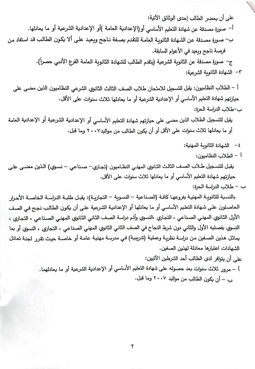 بالنسبة للثانوية المهنية بفروعها كافة الصناعية - النسوية - التجارية): يقبل طلبة الدراسة الخاصة الأحرار الحاصلون على شهادة التعليم الأساسي أو ما يعادلها أو الإعدادية الشرعية على أن يكون الطالب نجح في الصف الأول الثانوي المهني الصناعي ، التجاري النسوي وأتم دراسة الصف الثاني الثانوي المهني الصناعي ، التجاري ، النسوي بفصليه الأول والثاني دون شرط النجاح في الصف الثاني الثانوي المهني الصناعي ، التجاري ، النسوي أو بما يماثل هذين الصفين من دراسة نظرية وعملية تدريبية) في مدرسة مهنية عامة أو خاصة حيث تقرر لجنة تعادل الشهادات اعتبارها معادلة لهذين الصفين.