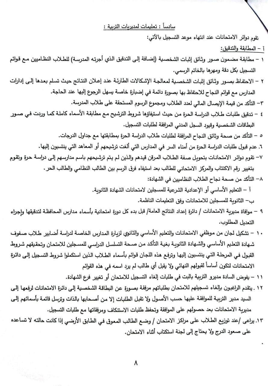 ٦. عدم قبول طلبات الدراسة الحرة من أمناء السر في المدارس التي ألغت ترشيحهم أو المعاهد التي ينتسبون إليها.