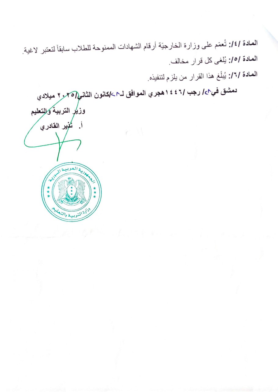 المادة / ٤/: تُعمّم على وزارة الخارجية أرقام الشهادات الممنوحة للطلاب سابقاً لتعتبر لاغية.