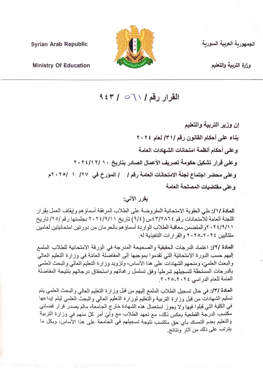المادة / ۲/ اعتماد الدرجات الحقيقية والصحيحة المدرجة في الورقة الامتحانية للطلاب الملمع إليهم حسب الدورة الامتحانية التي تقدموا بموجبها إلى المفاضلة العامة في وزارة التعليم العالي والبحث العلمي، ومنحهم الشهادات على هذا الأساس، وتزويد وزارة التعليم العالي والبحث العلمي بالدرجات المستحقة لتسجيلهم شرطياً وفق تسلسل رغباتهم واستحقاق درجاتهم بنتيجة المفاضلة العامة للعام الدراسي ٢٠٢٤-٢٠٢٥.