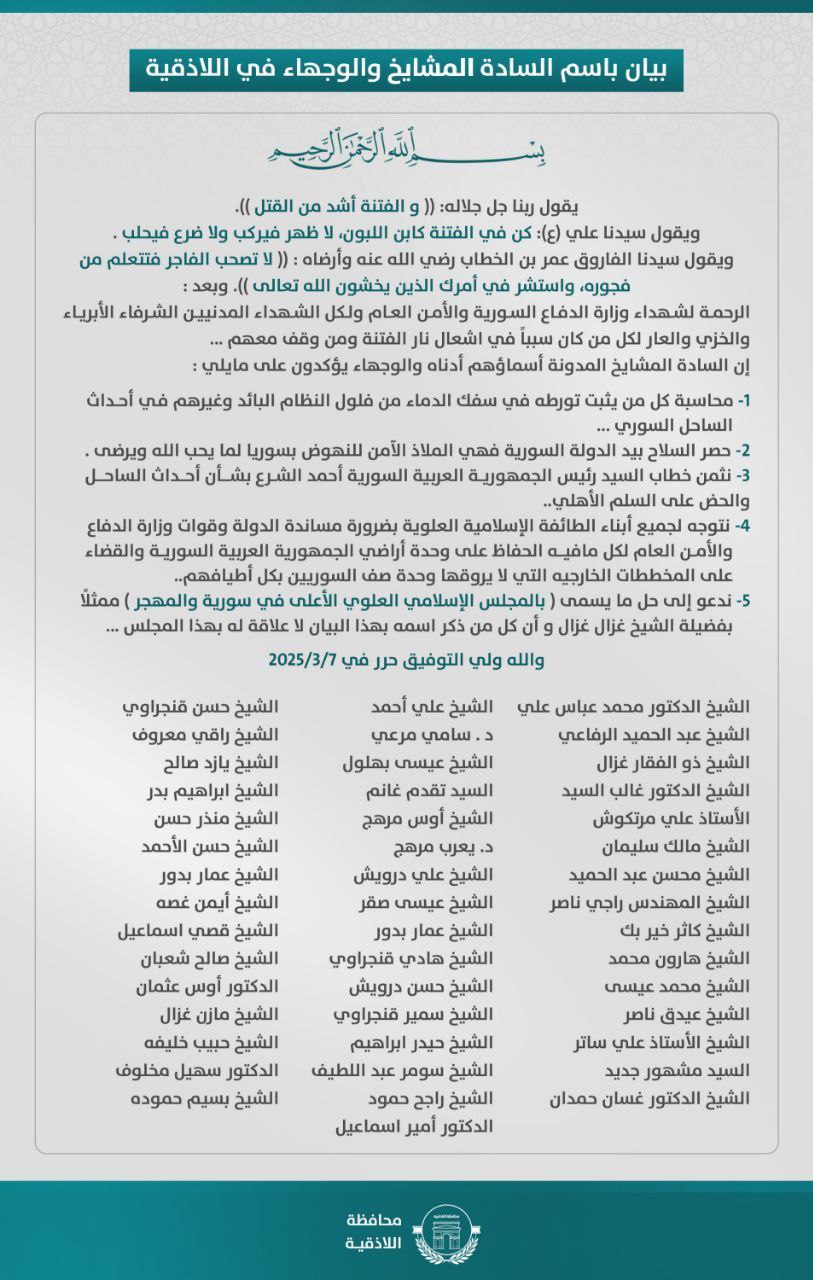 بيان باسم وجهاء محافظة اللاذقية حول أحداث الساحل يطالب بحلّ المجلس الإسلامي العلوي الأعلى