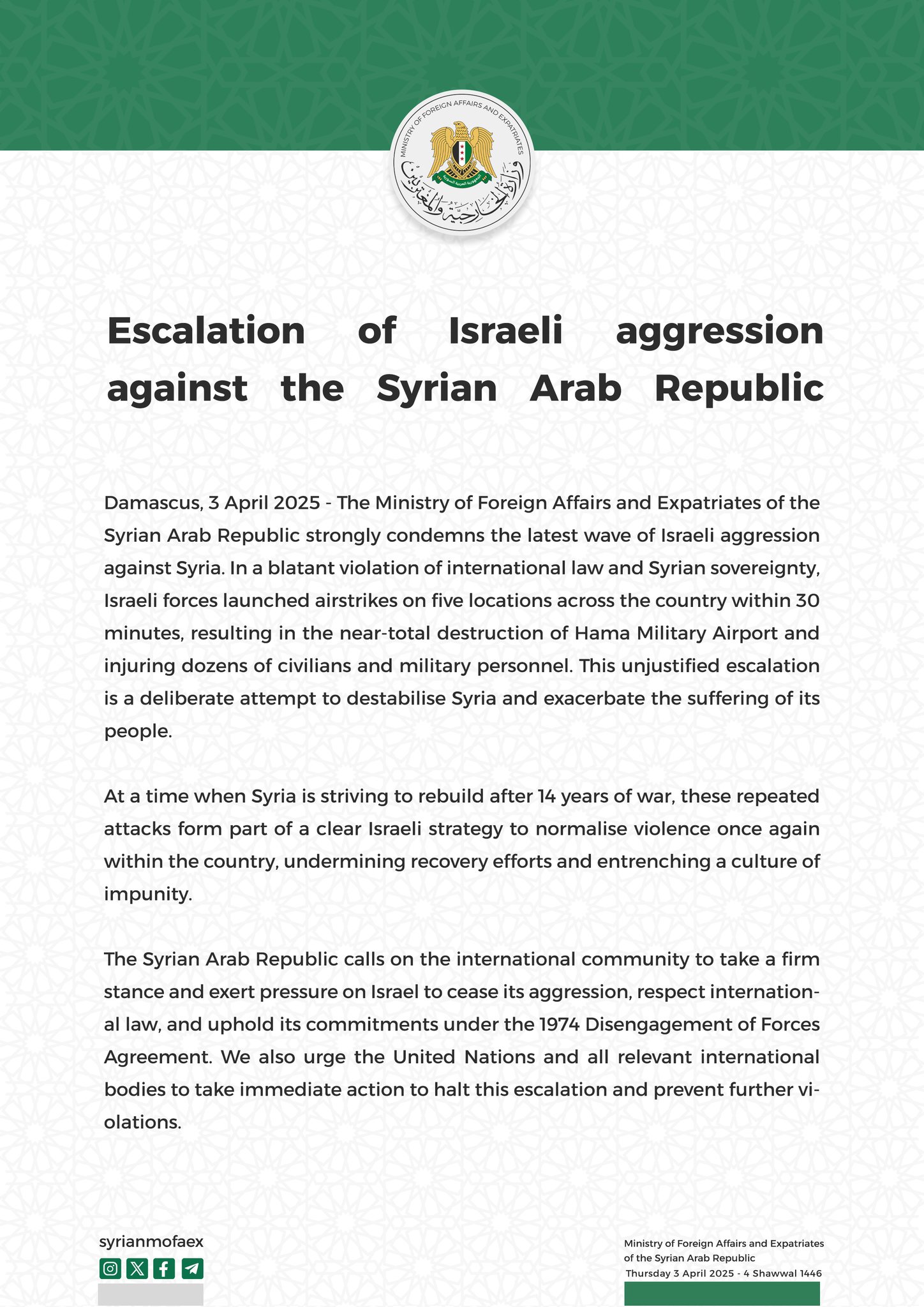 Escalation of Israeli aggression against the Syrian Arab Republic