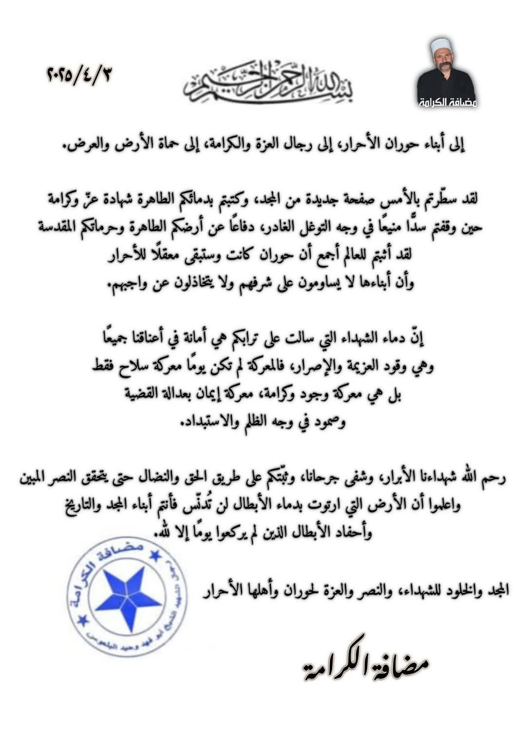 بيان تعزية مضافة الكرامة بشهداء درعا