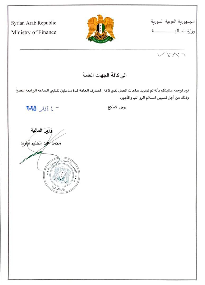 نود توجيه عنايتكم بأنه تم تمديد ساعات العمل لدى كافة المصارف العامة لمدة ساعتين لتنتهي الساعة الرابعة عصراً وذلك من أجل تسهيل استلام الرواتب والأجور.