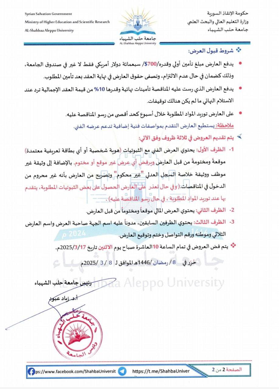 على الراغبين بالاشتراك في المناقصة المذكورة آنفاً من ذوي الخبرة والاختصاص، مراجعة مديرية الديوان العام في رئاسة الجامعة لتقديم عروضهم، وذلك من تاريخه وحتى نهاية الدوام الرسمي ليوم الأحد تاريخ 2025/3/16.
