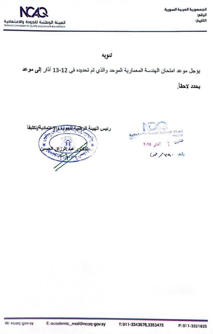يؤجل موعد امتحان الهندسة المعمارية الموحد والذي تم تحديده في 12-13 آذار إلى موعد