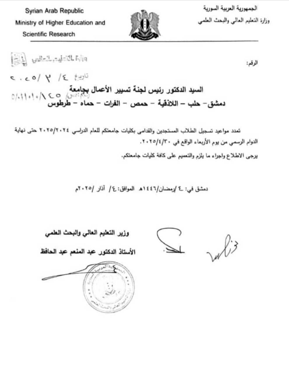 تمديد تسجيل الطلاب في الجامعات السورية حتى نهاية نيسان 2025