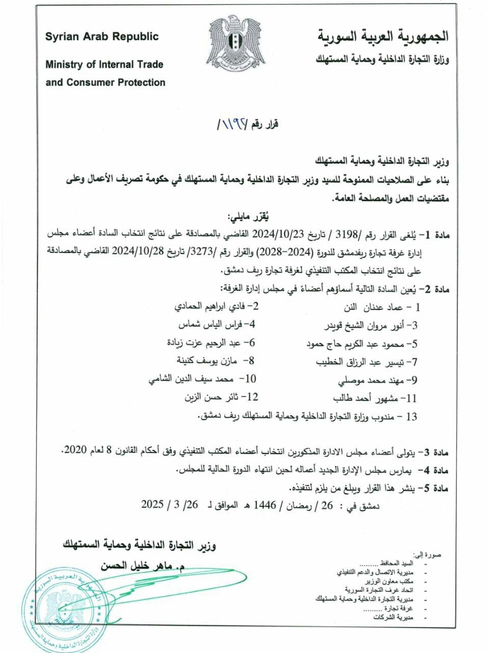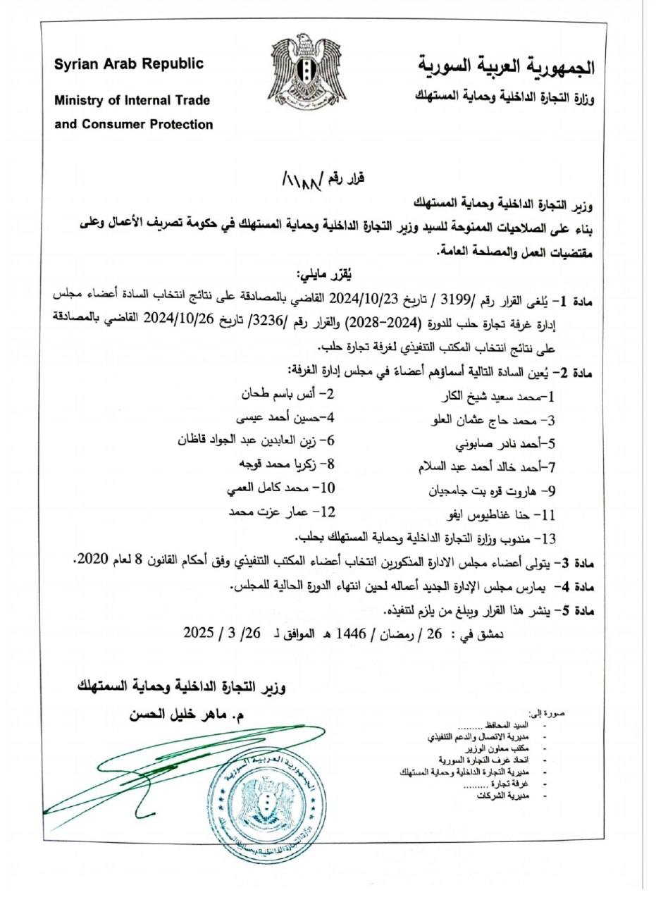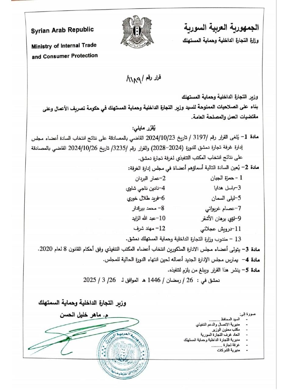 مادة 1- يُلغى القرار رقم 3197 / تاريخ 2024/10/23 القاضي بالمصادقة على نتائج انتخاب السادة أعضاء مجلس إدارة غرفة تجارة دمشق للدورة 2024-2028) والقرار رقم 3235/ تاريخ 2024/10/26 القاضي بالمصادقة على نتائج انتخاب المكتب التنفيذي لغرفة تجارة دمشق.