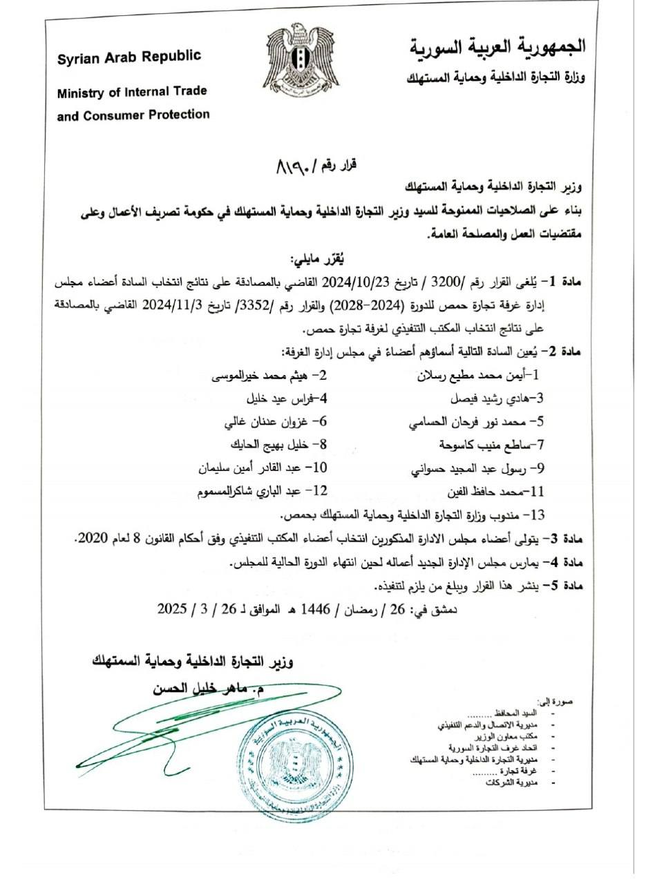 مادة -1- يُلغى القرار رقم 3200 / تاريخ 2024/10/23 القاضي بالمصادقة على نتائج انتخاب السادة أعضاء مجلس إدارة غرفة تجارة حمص للدورة 2024-2028) والقرار رقم 3352/ تاریخ 2024/11/3 القاضي بالمصادقة على نتائج انتخاب المكتب التنفيذي لغرفة تجارة حمص.
