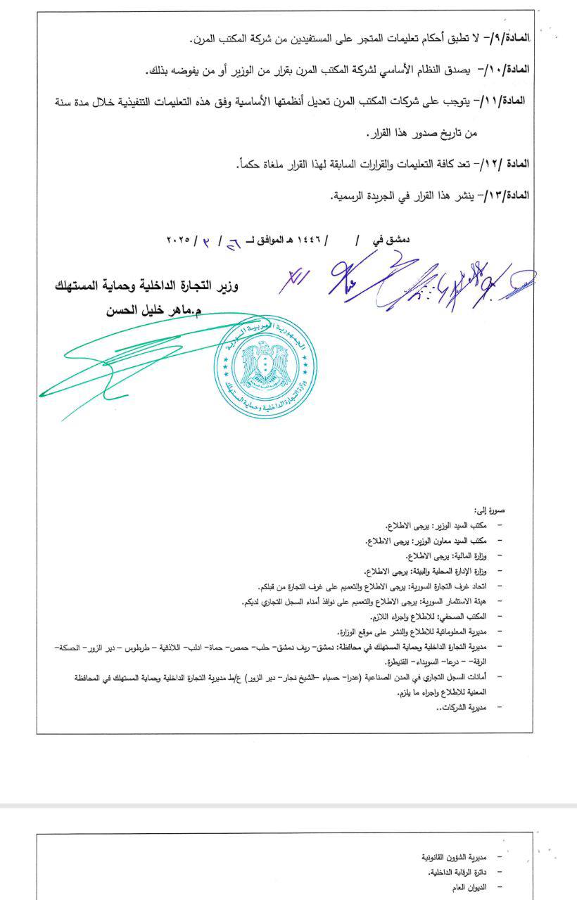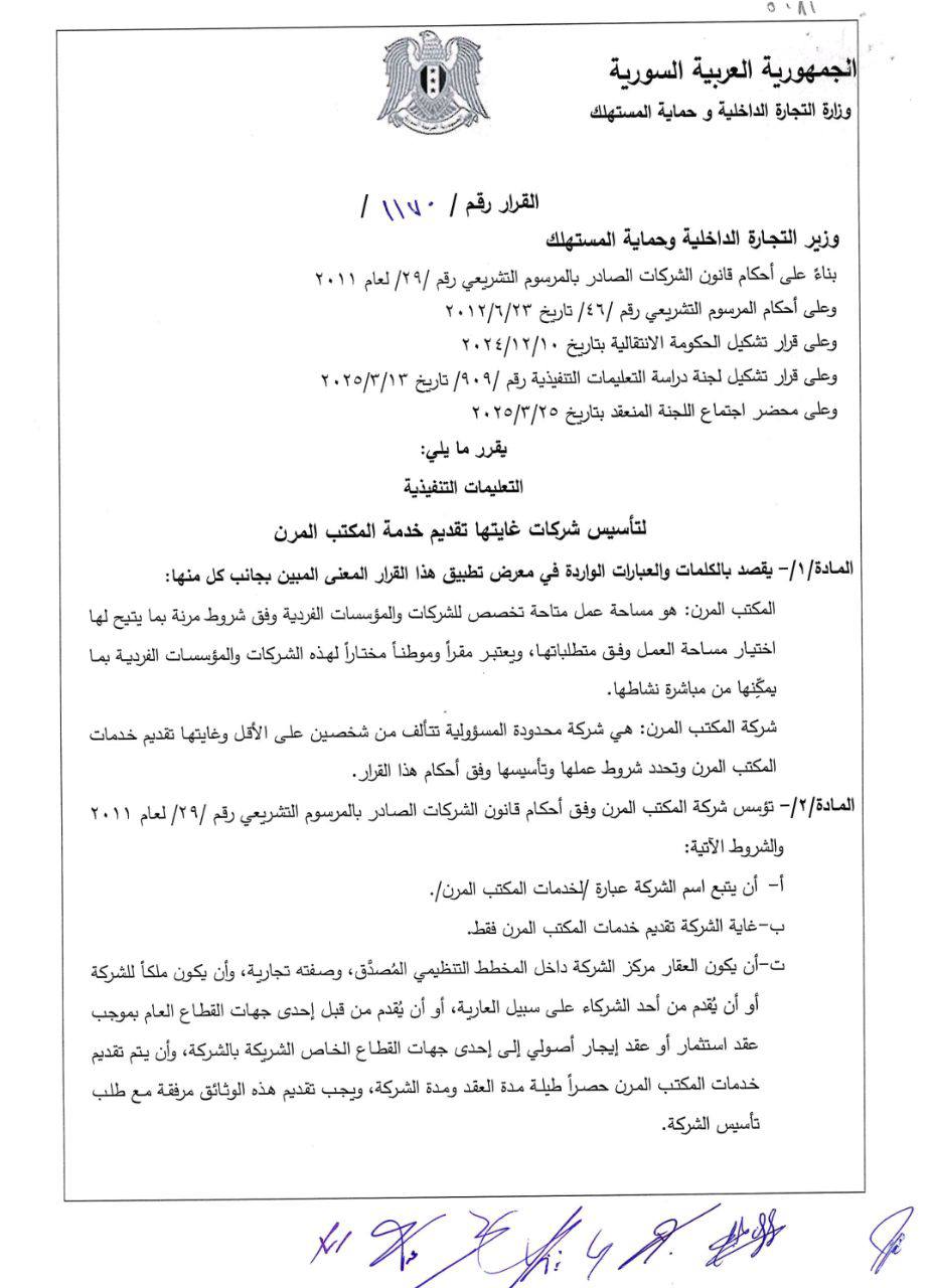 قرار وزارة التجارة الداخلية وحماية المستهلك رقم 1170: التعليمات التنفيذية لتأسيس شركات غايتها تقديم خدمات "المكتب المرن"
