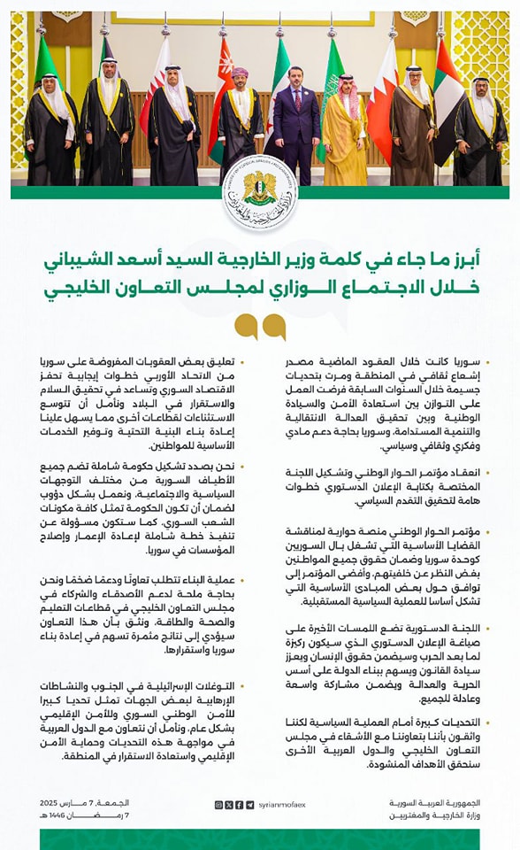 أبرز ما جاء في كلمة وزير الخارجية السيد أسعد الشيباني خلال الاجتماع الوزاري لمجلس التعاون الخليجي