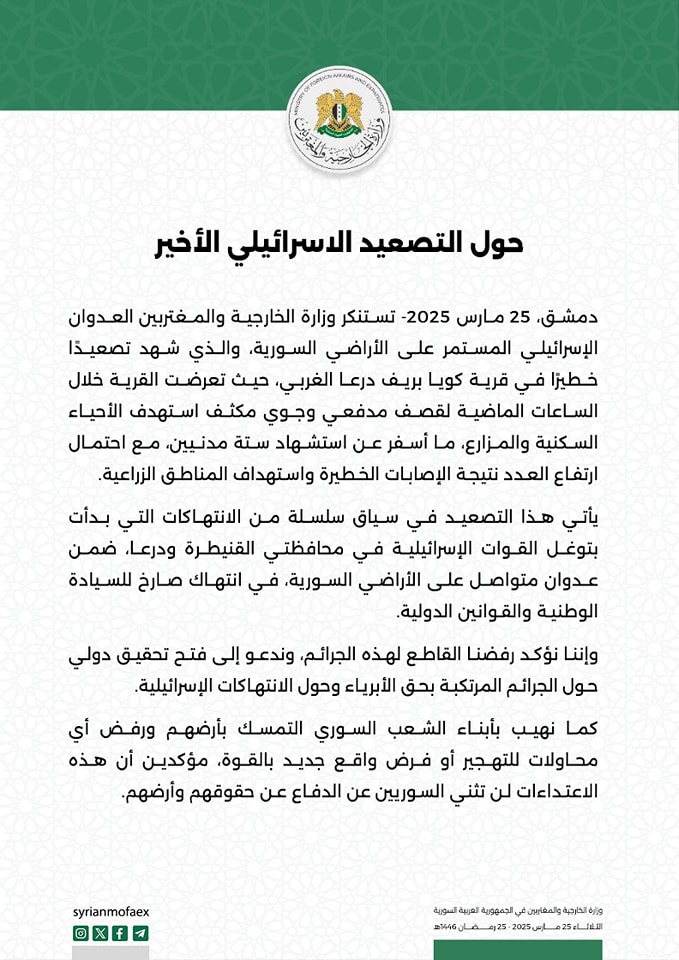 دمشق، 25 مارس -2025 تستنكر وزارة الخارجية والمغتربين العدوان الإسرائيلي المستمر على الأراضي السورية، والذي شهد تصعيدا خطيرا في قرية كويا بريف درعا الغربي، حيث تعرضت القرية خلال الساعات الماضية لقصف مدفعي وجوي مكثف استهدف الأحياء السكنية والمزارع، ما أسفر عن استشهاد ستة مدنيين، مع احتمال ارتفاع العدد نتيجة الإصابات الخطيرة واستهداف المناطق الزراعية.