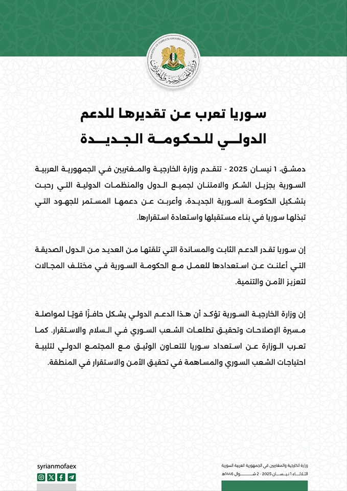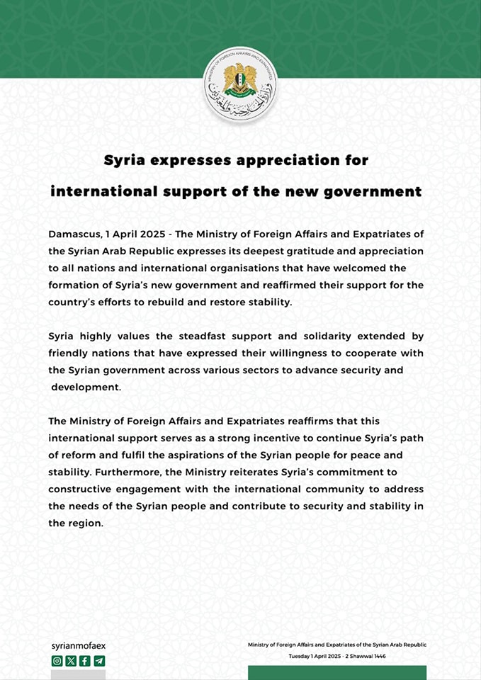 Damascus, 1 April 2025 - The Ministry of Foreign Affairs and Expatriates of the Syrian Arab Republic expresses its deepest gratitude and appreciation to all nations and international organisations that have welcomed the formation of Syria's new government and reaffirmed their support for the country's efforts to rebuild and restore stability.