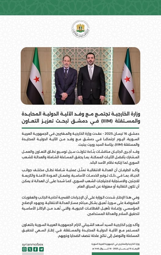 وأكد وزير الخارجية السيد أسعد الشيباني التزام الجمهورية العربية السورية بالتعاون المستمر مع الآلية الدولية المحايدة والمستقلة في إطار السعي لتحقيق المساءلة والتوصل إلى نتائج عادلة تنصف الضحايا وذويهم.