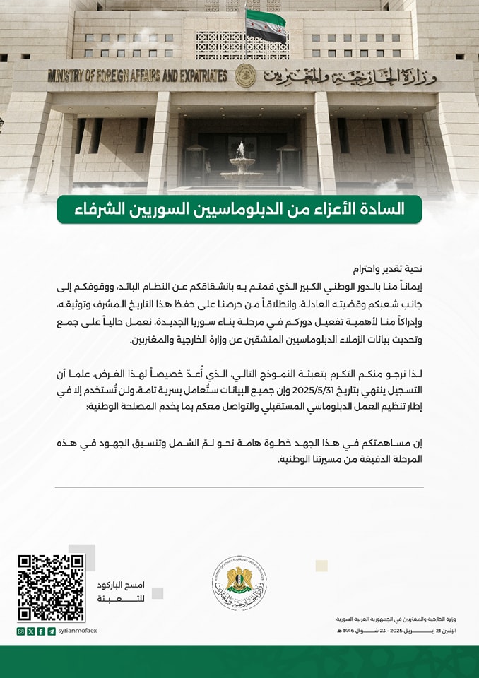تصريح وزارة الخارجية والمغتربين: دعوة الدبلوماسيين المنشقين لتحديث بياناتهم تمهيداً لإعادة دمجهم في العمل الوطني