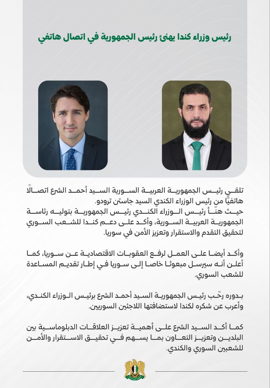 تلقي رئيس الجمهورية العربية السورية السيد أحمد الشرع اتصالا هاتفيا من رئيس الوزراء الكندي السيد جاستن ترودو.
