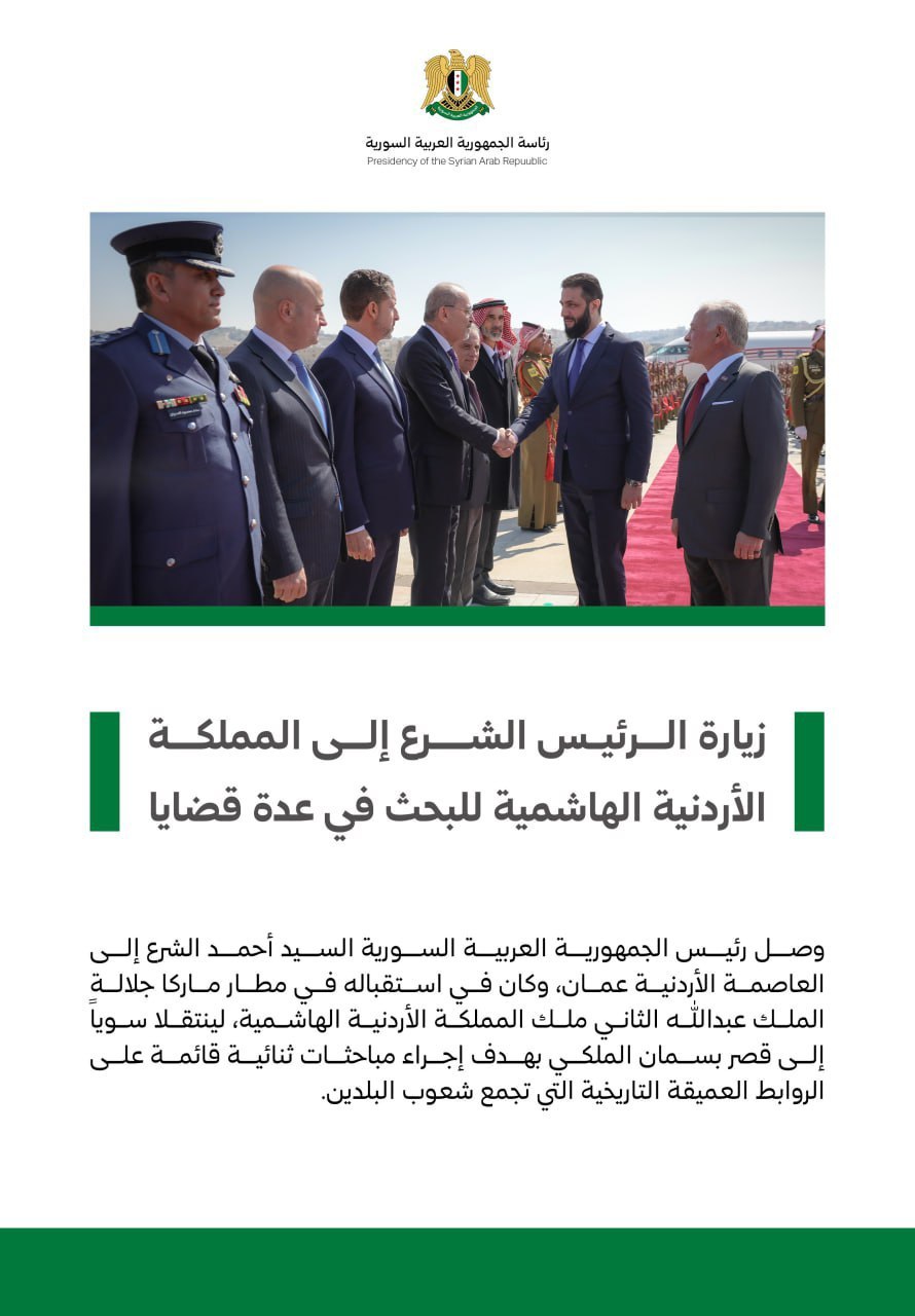 زيارة الرئيس الشرع إلى المملكة الأردنية الهاشمية للبحث في عدة قضايا