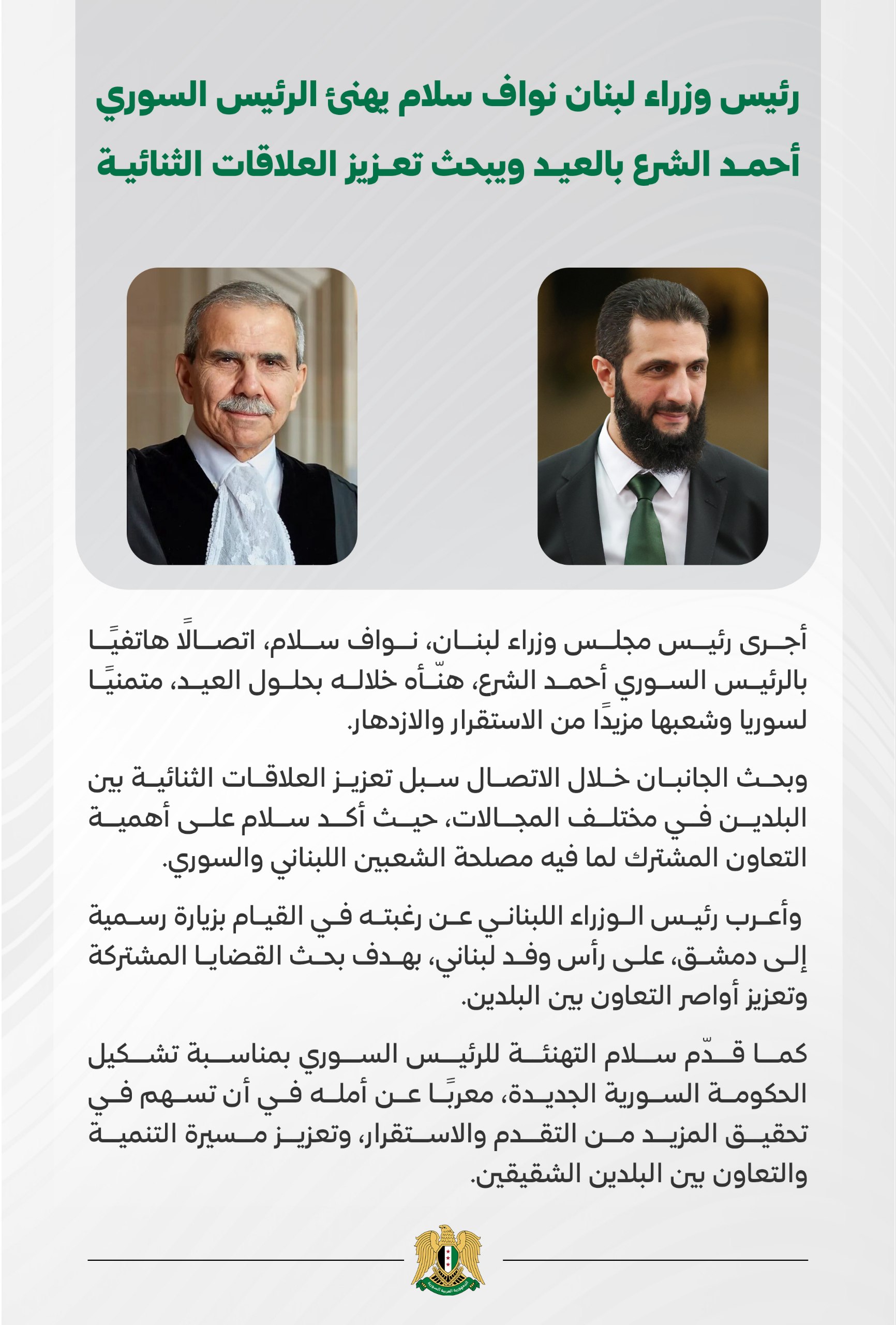 تصريح صحفي: رئيس الوزراء اللبناني يهنئ الرئيس السوري أحمد الشرع بعيد الفطر