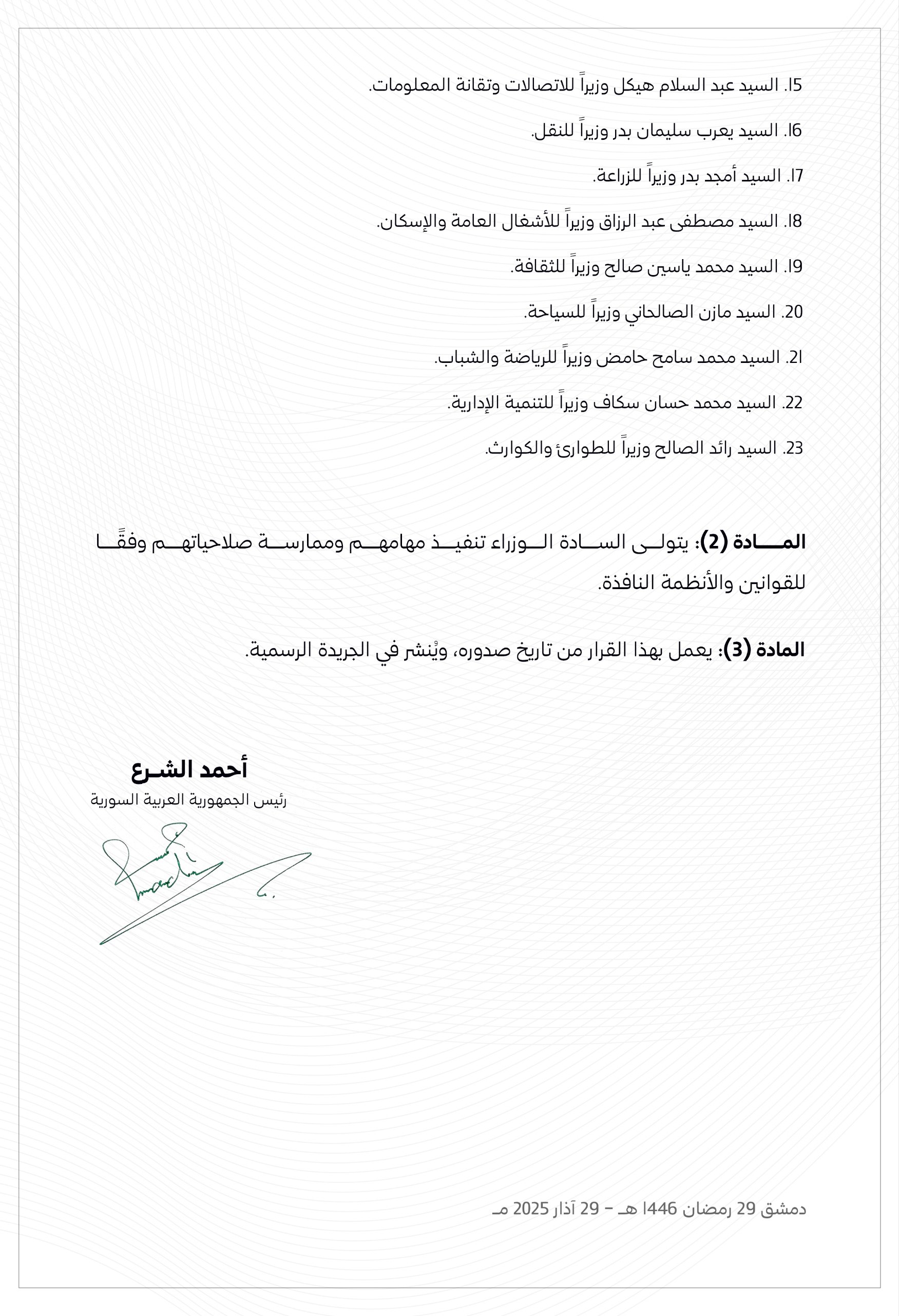 المادة (1): يعين السادة التالية أسماؤهم أعضاء في الحكومة السورية الجديدة: