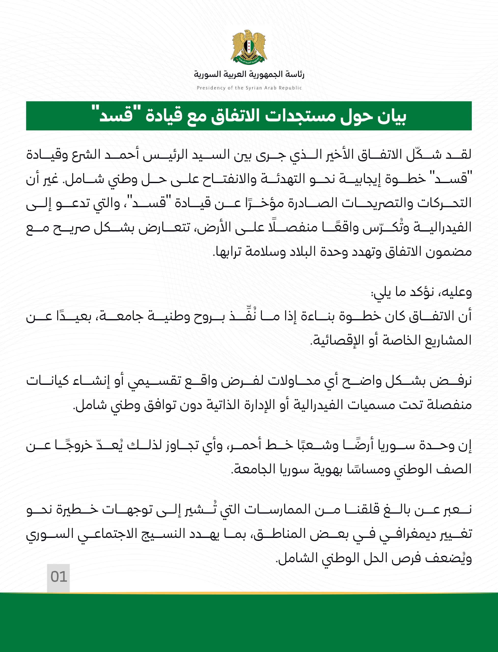 بيان رئاسي حول مستجدات الاتفاق مع قيادة "قسد"