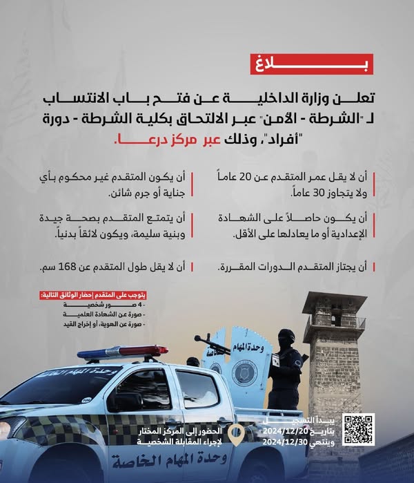 تعلن وزارة الداخلية عن فتح باب الانتساب لـ "الشرطة - الأمن" عبر الالتحاق بكلية الشرطة - دورة "أفراد"، وذلك عبر مركز درعا.