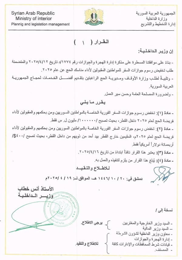 - مادة (۱) تخفض رسوم جوازات السفر الفورية الخاصة بالمواطنين السوريين ومن بحكمهم والمقبولين لأداء فريضة الحج لعام ۲۰۲۵ داخل القطر، بحيث تصبح / ۱۰۰۰۰۰۰/ مليون ل. س فقط.